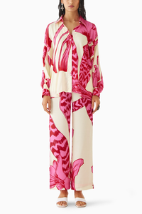 The Pink Aphrodite Shirt & Trousers Co-ord crafted from our stunning vegan silk fabrication , trans-seasonal, is a statement piece. The co-ord, made in our hand drawn Aphrodite print, has a relaxed fit. With full sleeves , the piece has a front shell buttons and hand embroidered sequin patches. Featuring a summery look, it is paired with our Pink Aphrodite trousers with a waistband and pockets. Wear it with heels for an elegant look.