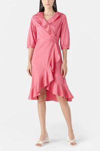 Own your elegance with this sweet pink skater wrap dress with ruffles all around in white printed satin. Perfect for your day and night outings.