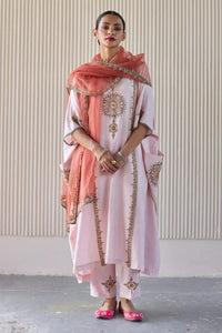 Featuring the Pink Bindi Kaftan Suit by Sarang Kaur from the Patiala Collection. This elegant ensemble includes a hand-embroidered Chandheri silk kurta, matching pants, and a delicate organza silk dupatta, offering a refined and sophisticated look for any occasion.