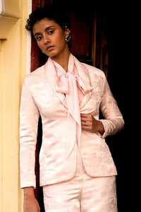 Brocade blazer in jacquard textured and patterned fabric in soft tones of pink. Shawl collar lapels with a single marble and gold-detailed button.