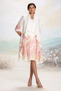 A stylish jacket dress featuring a cascading shawl collar and 3/4 sleeves. Hand-screen printed with blobs of paint, the design creates an artistic elegance with abstract floral patterns that gracefully flow along the hem and sleeves. The soft hues of blue and pink add a vibrant yet refined touch, making this piece a modern and chic statement for any occasion.