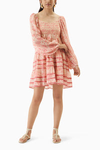 Fea turing a pink knee length dress cra fted in viscose georgette. It ha s double coloured smocking deta il a t the chest a nd ba ck to give it a fitted look. The voluminous skirt is deta iled with fine la ces. The sleeves a re ela stica ted a t cuff.