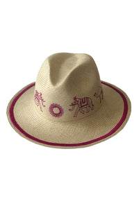 The hat is inspired by the pink city of Jaipur. It is handwoven in Columbia from natural toquilla straw and hand-embroidered in India.
