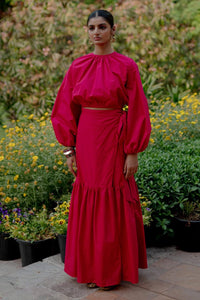 The Clove Top and Wrap Skirt set is crafted from breathable BCI cotton poplin for all-day comfort and style. The top features a gathered neckline and full sleeves with a relaxed fit, while the full-length wrap skirt offers a flattering silhouette with an adjustable waist and gathered hem. Together, they create an elegant and polished look with effortless charm.