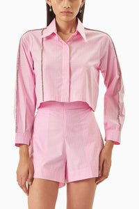 The Cotton Pink Checks Embellished Crop Shirt is a playful and stylish piece that blends classic charm with modern detailing. Made from soft, breathable cotton, it features a fresh pink check pattern that exudes a light, feminine vibe. The delicate embellishments add a subtle touch of sparkle and texture, elevating the shirt with refined flair. With its cropped silhouette and flattering fit, this shirt is perfect for pairing with high-waisted bottoms, offering a chic, effortless look for everyday wear or casual outings.