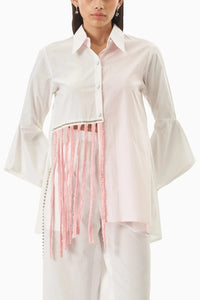 This pink two-panel shirt is a standout piece that blends playful charm with refined detailing. Featuring intricate tassels and stud embellishments, it’s elevated further by beautifully crafted sleeves that add dimension and elegance. A perfect fusion of soft color, texture, and modern flairâ€â€ideal for making a stylish statement.