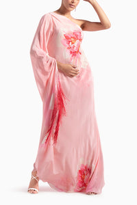Embrace elegance in our Pink Crepe Kimono Sleeve Asymmetrical Dress. With flutter kimono sleeves and ombre fringes, it's a captivating choice for a sophisticated and stylish look.