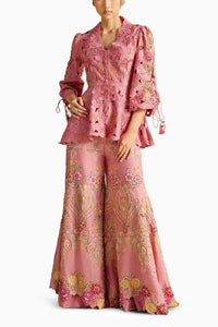Featuring pink chanderi cutwork and beadwork peplum jacket with tie-up detail split sleeves paired withpink chanderi contrast cordwork, beadwork and cutwork embroidered sharara pants.