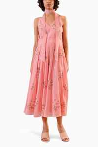 Featuring the Pink Dahlia Print Strap-Dress, exquisitely crafted in Cotton Chanderi fabric. This elegant garment showcases a vibrant block print design, adding a touch of sophistication to your ensemble.
