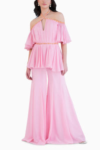 Pink Embroidered Cross Neck Jumpsuit With Flared Sleeves