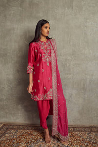 Featuring a pink tunic in cheniya silk base with zardozi embroidery. It is paired with matching dhoti pants and a dupatta. The set is crafted with the finest materials and will accentuate the look.
