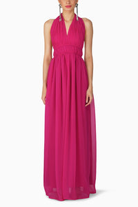 Grace your next event in the striking Fina Dress. This vibrant, maxi-length gown is crafted from lightweight georgette, creating a fluid and elegant drape. The dress features a deep V-neck that flows into a delicate, ruched halter neckline. The front ties up at the neck, creating a stunning open back and a chic, sophisticated silhouette. A smocked waistband defines the figure, while the full, flowing skirt adds beautiful movement, making this a perfect choice for a sophisticated evening or a special occasion.