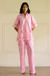 Add charm to your wardrobe with this pink floral co-ord set, featuring a collared shirt embellished with crochet flower patches on the sleeves and lower half. Scalloped detailing on the sleeves and hem enhances its elegance. The matching pants include a side crochet flower patch for a cohesive look.