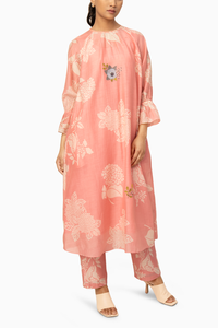 Featuring a pink floral printed tunic and pant set crafted from luxurious chanderi fabric. This elegant ensemble features a tunic with convenient pockets and exquisite gather detailing on the neckline, exuding timeless sophistication and effortless style.