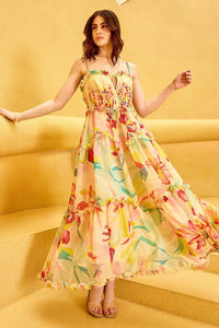 Vibrant floral maxi dress with ruffle-tiered layers, Pearl embellishments on the shoulder straps offer a touch of elegance, while the gathered bodice provides a comfortable and flattering fit.