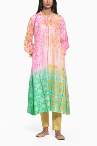 Make ombre your perfect styling companion from dusk to dawn in our Pink Green Ombre Shibori Tunic. With a beautiful color combination, this tunic will bring fresh vibes when styled for festivities and weddings. This tunic has ruffle detailing on the neckline, finished with handmade bori button closure and elasticated sleeves with ruffle finish. It is also hand-crafted with sequins.