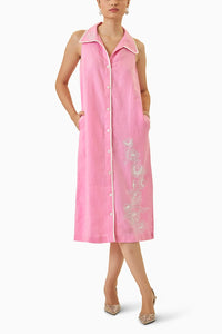 Featuring Pink Hand Embroidered Shirt Dress by Anahe Design. Elevate your wardrobe with our exquisite shirt dress, featuring nalki hand embroidery in a delicate pink hue. Made from premium linen fabric, this dress combines comfort with refined elegance, making it perfect for any occasion.