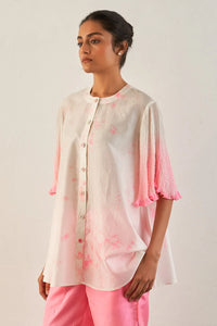 Featuring a silk shibori shirt in pink, this elegant piece stands out with its ombre chiffon shibori sleeves, blending artisanal dyeing techniques with soft, modern sophistication.