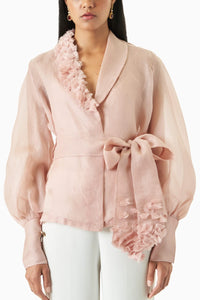 Bishop sleeve wrap shirt featuring decorative organza details on the lapel and belt for a sophisticated touch.