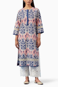 Featuring Pink Kainoosh lawn cotton kurta and palazzos with crochet lace detailing.