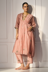 Featuring Pink Kashni Kaftaan set by Sarang Kaur by Mansa Collection. This set showcases Chanderi silk Kurta and pants in a charming pink hue, blending traditional craftsmanship with contemporary style, perfect for a graceful and elegant look on any occasion.