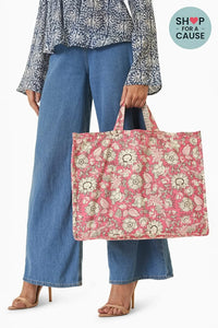 Featuring the Pink Large Tote Bag, crafted from 100% cotton with a charming flower pattern and striped lining. This spacious tote serves as an effortless carryall, perfect for busy days of shopping or running errands with style and convenience.