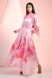 Featuring Pink Love Printed Asymmetrical Dress by Mandira Wirk's Love Note Collection. This satin asymmetrical dress features exquisite 3D embroidery on the yoke and tassel details on the belt, blending elegance with unique, eye-catching accents.