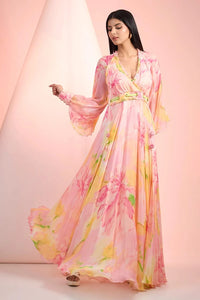 Featuring Pink Love Printed Rivet Dress by Mandira Wirk's Love Note Collection. This chiffon printed long dress is accentuated with rivet details on the waist and a stylish belt, combining delicate fabric with edgy embellishments for a chic look.
