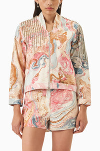 The Pink Denim Marble Jacket with Stud Embellishment is a bold fusion of modern texture and edgy detailing. Featuring a unique marble-washed pink denim, this jacket stands out with its soft, artistic finish and contemporary vibe. The addition of stud embellishments adds a touch of rebellious sparkle, creating a striking contrast against the pastel tones. With its structured fit and statement design, this jacket is perfect for adding a confident, fashion-forward edge to any outfit.