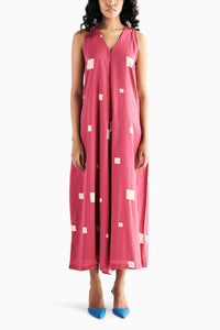 This pink printed jumpsuit features a front zipper opening and a V neckline, designed in a classic A-line silhouette for a flattering fit. Crafted from soft, breathable cotton mul, it ensures comfort and style. The jumpsuit is fully lined for a smooth finish and includes side seam pockets for added convenience, making it both practical and chic.