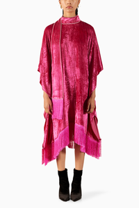 The Miller Velvet Kimono with Fringe crafted from our stunning Viscose Velvet fabrication, trans-seasonal, is a statement piece. The dress, made in our hand dyed velvet, is Free Size. With a high neckline and embroidered swarvoski on the collar and drape, it is chic. Featuring a back opening and fringes, this dress is the ultimate party dress and can be styled in different ways. Wear it with heels for an elegant look.