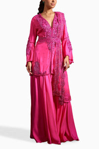 Featuring Yellow Munira Embellished Kurta Set in Habutai Silk. Hand Embellished in Yellow hues. Kurta has a front fastening with bell sleeves and backless with drawstring. Paired with sharara. Styled with embroidered dupatta in Organza, It has an embroidered belt drawstring.