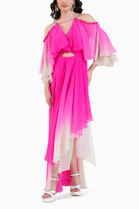 Featuring the Pink Ombre High Low Dress with Shoulder Cutout and Flared Sleeve by Mandira Wirk's Waves of Love Collection. This stunning georgette dress features a beautiful pink ombre design, stylish shoulder and waist cutouts, and elegant flared sleeves, perfect for making a chic statement at any occasion.