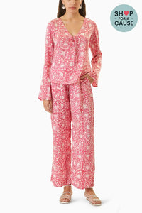 Featuring the Pink Pali Top and Chail Pants ensemble. The Pali top, crafted from hand-block printed satin, showcases a straight fit with a charming v-neck adorned with a tassel tie at the front and elegant bell sleeves. Paired with Chail Pants, which feature a relaxed straight fit in the same satin fabric, with an elasticated back waist, front button closure, concealed zip, and practical side pockets. This set in pink satin combines stylish design with comfort for versatile and elegant attire.