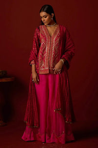 Radiate elegance in this Rani Pink Patola Peplum Jacket, exquisitely embellished with intricate Marodiwork and beadwork, complemented by playful tassels and refined inner finishes. Paired with matching Organza Sharara pants featuring delicate Marodiwork and satin accents, and a soft Chanderi Crushed Dupatta with tassel details, this ensemble beautifully blends traditional artistry with contemporary flair—perfect for festive occasions and celebrations.