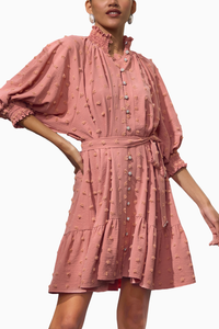 Perfect for sunny strolls, this shift dress lends a chic touch of texture. smocked high neck, smocked details, Button Closure. Above knee length