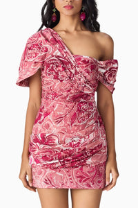 Featuring the Pink Pottery Rochelle Dress by Saaksha & Kinni's Nirah Collection. This abstract floral print mini dress showcases elegant drapery detailing, a cold-shoulder strap, and a surplice sheath design, creating a chic and sophisticated silhouette.