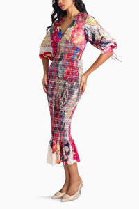 Featuring the Pink Prime Abra Dress by Saaksha & Kinni's Nirah Collection. This midi dress showcases an abstract floral print with an elasticated bodice, delicate tie-up sleeves, and a frilled lower layer, blending effortless charm with contemporary elegance.