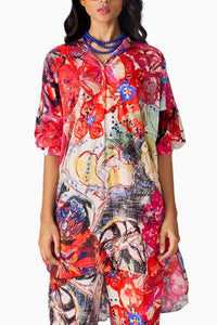 Featuring Pink Prime Akira Kurta by Saaksha & Kinni's Nirah Collection. This sophisticated tunic showcases an abstract floral print with an asymmetric collared design, blending modern structure with effortless elegance.