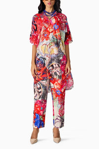 Featuring Pink Prime Akira Kurta with Pants by Saaksha & Kinni's Nirah Collection. The asymmetric collared tunic showcases an abstract floral print, paired with high-waist trousers featuring the same print, creating a contemporary yet elegant ensemble.