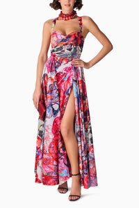Featuring Pink Prime Valerie Dress by Saaksha & Kinni's Nirah Collection. This elegant maxi dress showcases a floral print, sweetheart neckline, surplice bustier, and cross-back straps, complemented by an elasticated back and a customizable side slit for a perfect blend of style and comfort.