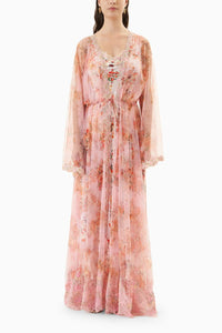 Elevate your loungewear with this supremely chic coral robe set. It features net fabric with print long belted shrug and a fitted silk satin slip. Pair the set with a white bag and sandals to make the ensemble work for a day out.