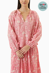 The Pushkar Blouse, features voluminous sleeves and a tassel neck tie, in a block printed fabric.