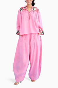 Featuring Pink Rose Bubble Sleeves Top by Nikasha from Matchbox Series. This bubbles sleeves top comes with vintage rose printed yoke and hand stitched details at the hem in 100% cotton linen.