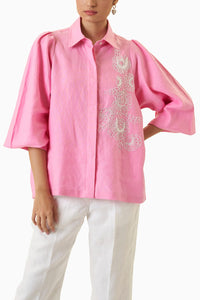 Featuring Pink Rose Embroidered Shirt by Anahe Design. Embrace timeless elegance with our pink linen shirt, delicately adorned with thread-embroidered roses. This shirt combines the softness of linen with the beauty of floral embroidery, creating a romantic and timeless piece for your wardrobe.