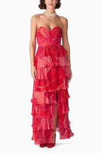 Featuring Pink Scratch Flower Dua Dress by Saaksha & Kinni's Nirah Collection. This exquisite maxi dress showcases an abstract floral print, a sweetheart neckline, a surplice bustier, and a dramatic seven-tier silhouette, exuding elegance with a contemporary flair.