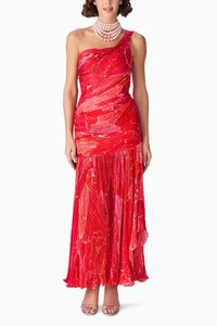 Featuring Pink Scratch Flower Raya Dress by Saaksha & Kinni's Nirah Collection. This striking one-shoulder dress showcases an abstract floral print, delicate hand micro pleats, a fitted bodice, and an asymmetric side slit, exuding modern elegance with a bold edge.