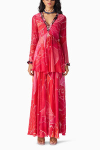 Featuring the Pink Scratch Noor Kurta with Palazzo from Saaksha & Kinni's Nirah Collection. The abstract floral print blouse features hand-embroidered pearls, mirrors, and tassels on the neckline and cuffs. Paired with a high-waist abstract floral print palazzo for a perfect, elegant look.