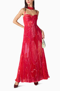 Featuring the Pink Scratch Flower Kiara Dress by Saaksha & Kinni's Nirah Collection. This maxi dress showcases an abstract floral print with delicate hand micro pleats and adjustable straps, offering a graceful and versatile silhouette.