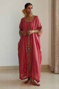 Featuring Pink Shashi Kaftaan by Sarang Kaur by Akaari Collection. Crafted by Chanderi silk with a comfortable cotton undershirt, this kaftaan radiates elegance in a delicate pink hue. Perfect for any occasion, it combines refined style with effortless comfort.